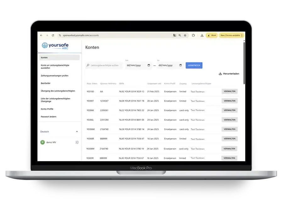 Les IBANs Sponsorisés Yoursafe sont une solution éprouvée en Europe qui permettent aux sponsors de distribuer des fonds efficacement aux bénéficiaires tout en conservant un contrôle total. Chaque bénéficiaire reçoit un IBAN unique, visible uniquement dans l’outil Sponsor. Les sponsors choisissent s’ils souhaitent ou non partager l’IBAN avec les bénéficiaires, garantissant ainsi une gestion sécurisée et maîtrisée des fonds. Cette approche innovante donne aux sponsors plus de contrôle tout en offrant aux bénéficiaires un accès sécurisé au soutien financier.